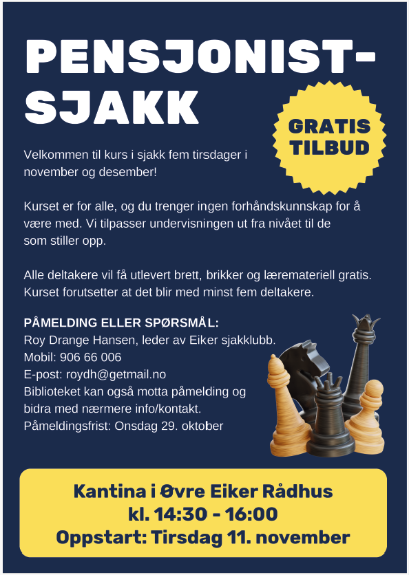 Eiker Sjakklubb arrangerer gratis kurs for pensjonister med oppstart tirsdag 11.nov på kantina på rådhuset i Hokksund